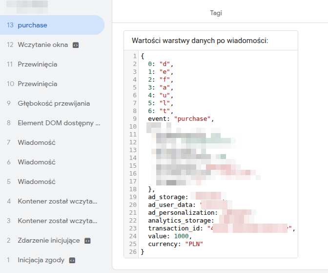 Jakie dane przekazujemy w tym zdarzeniu? Zgodnie z widokiem Twojej warstwy danych, po zakupie dostępne są następujące klucze (zmienne), które możesz przechwycić w GTM: