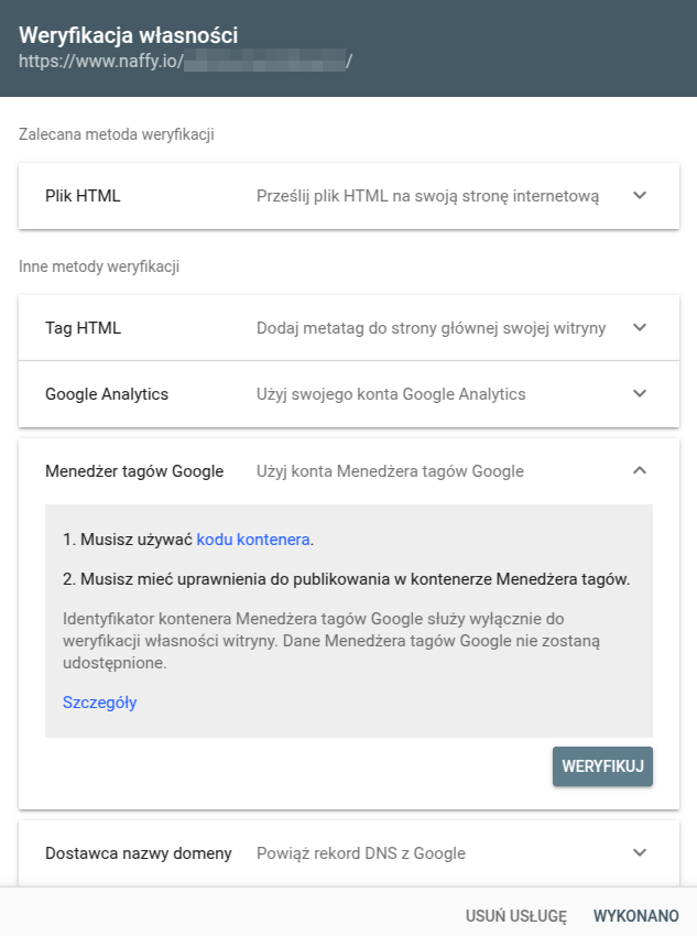 Wybierz w nim Menedżer tagów Google (jest to obecnie jedyna wspierana opcja weryfikacji przez naffy).